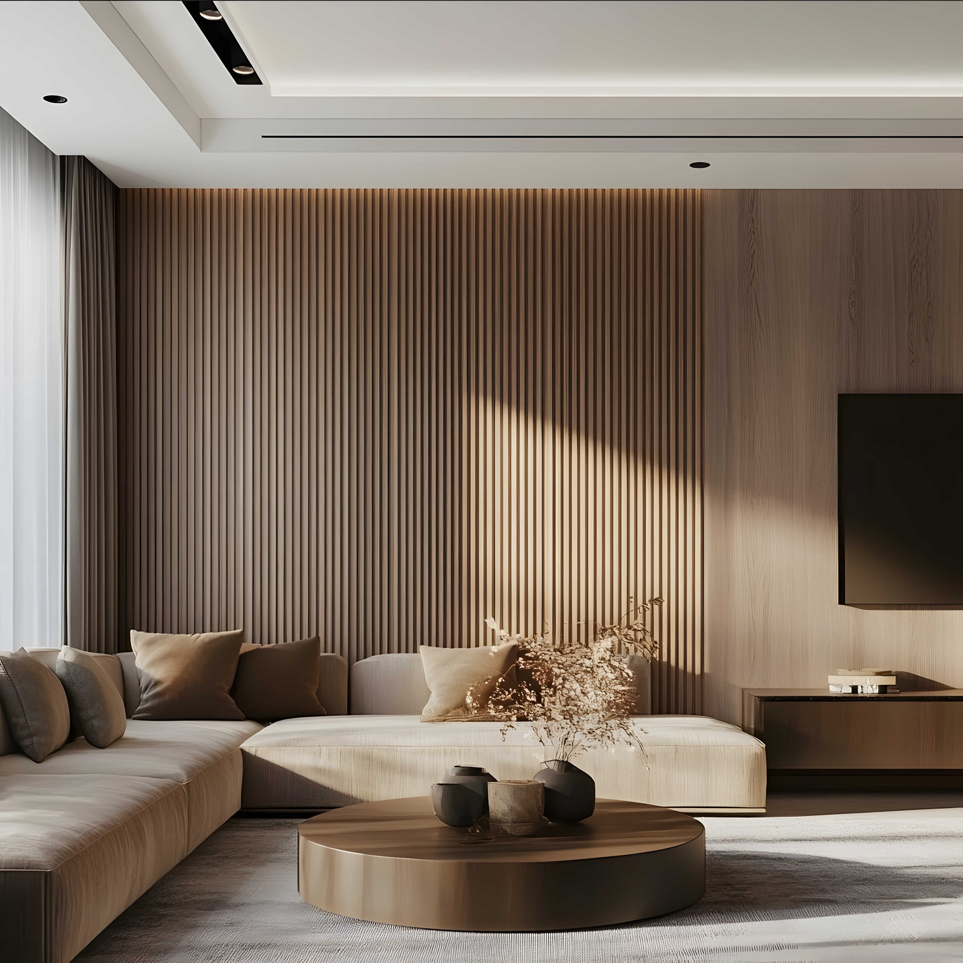 Modern living room with fluted wall panels, sleek sofa, and contemporary decor.